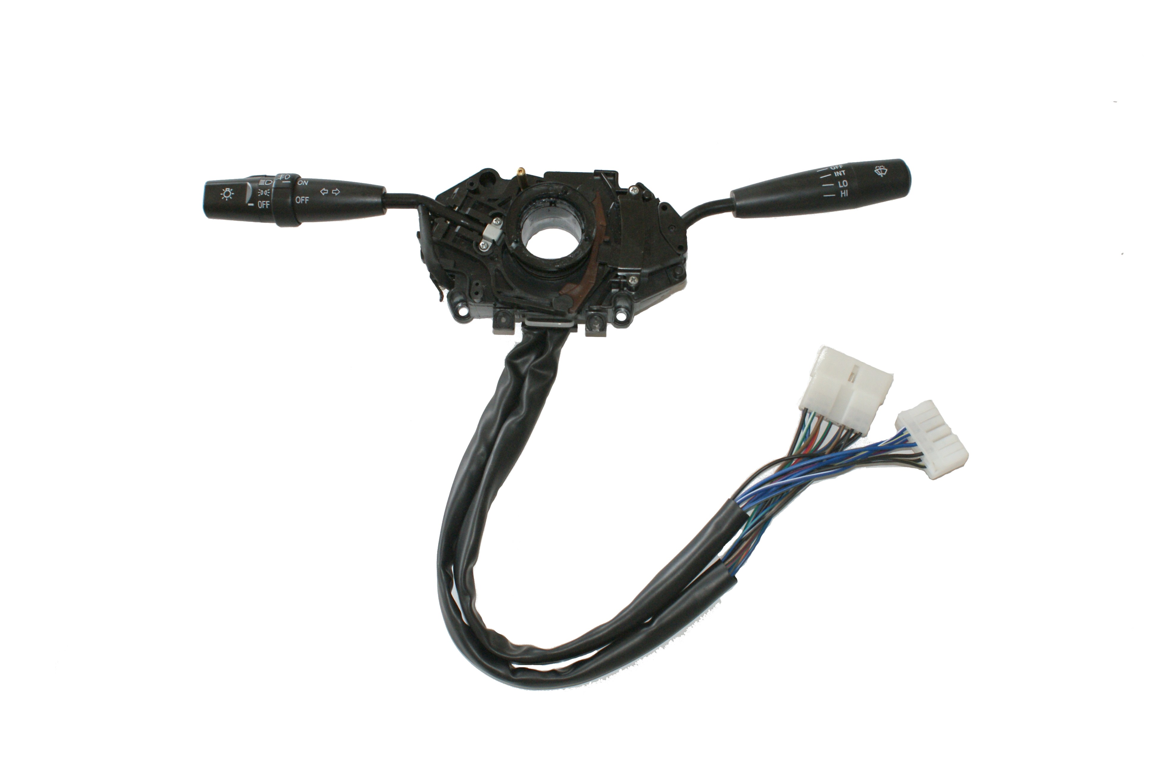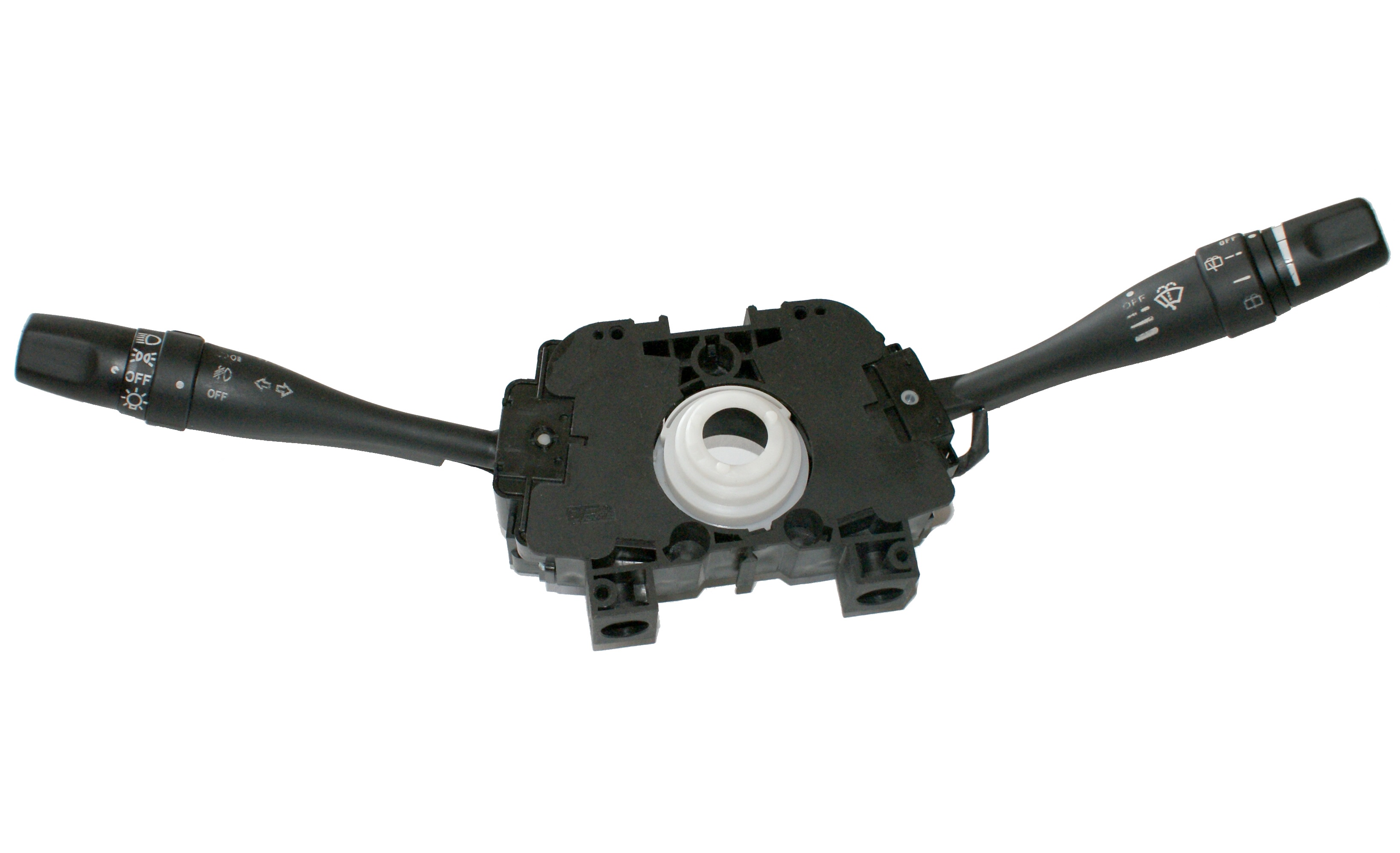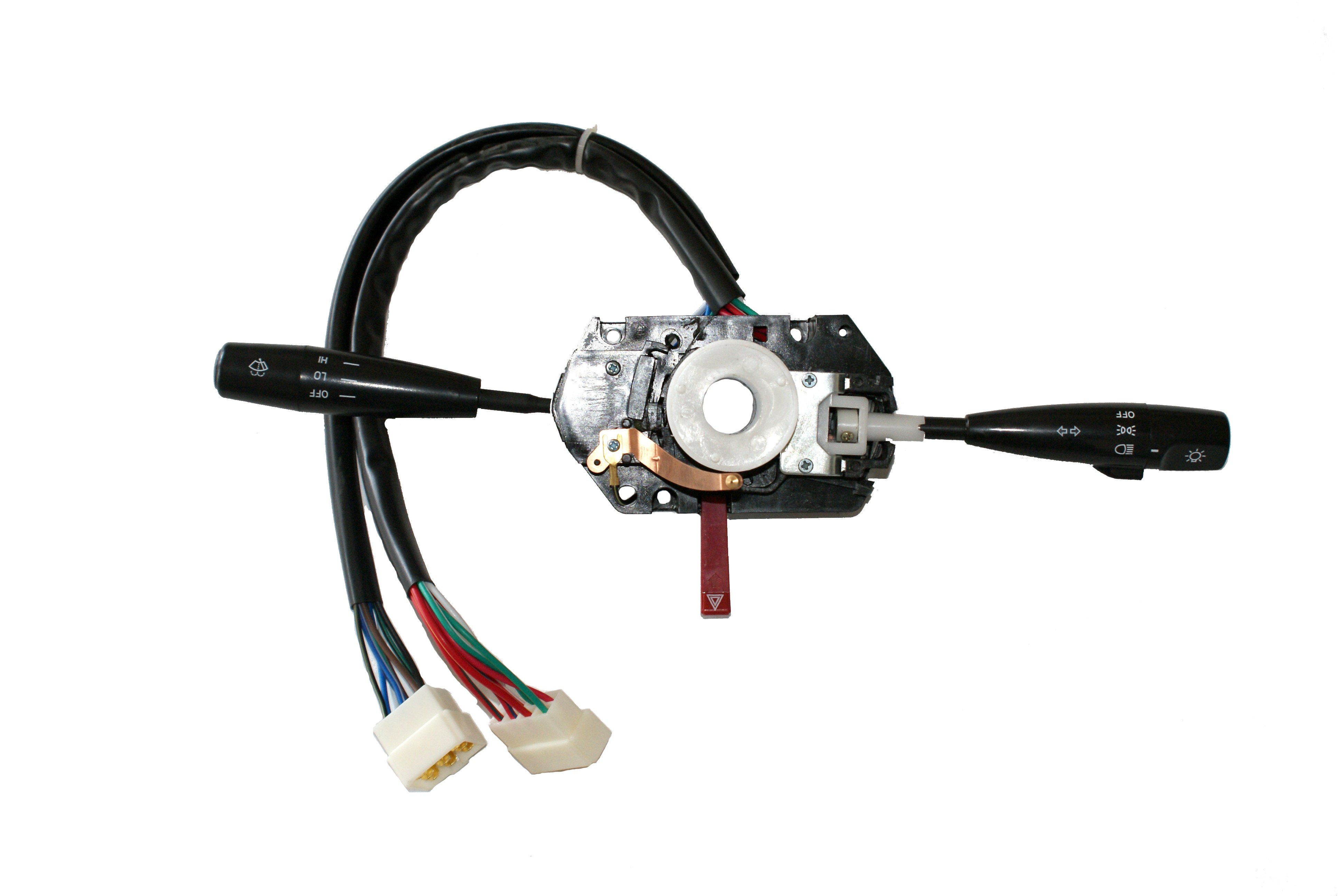 汽車組合開關(guān)一個操作手柄控制雨刮和洗滌器開關(guān),另一個操作手柄控制轉(zhuǎn)向燈、車燈和變光開關(guān),另外一些汽車組合開關(guān)還裝有喇叭開關(guān)和多個備用開關(guān),可以控制汽車上多種電器的通斷。